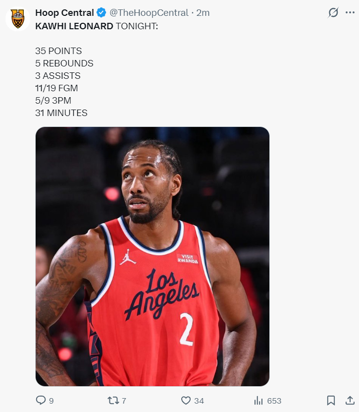全场比赛小卡仅仅打31分钟,19中11,三分9中5,拿到35分5篮板3助攻1失误,命中率57.9%,三分命中率55.5%,真实命中率76.2%,正负值+8。过去的12场比赛小卡正负值+96快船第一。